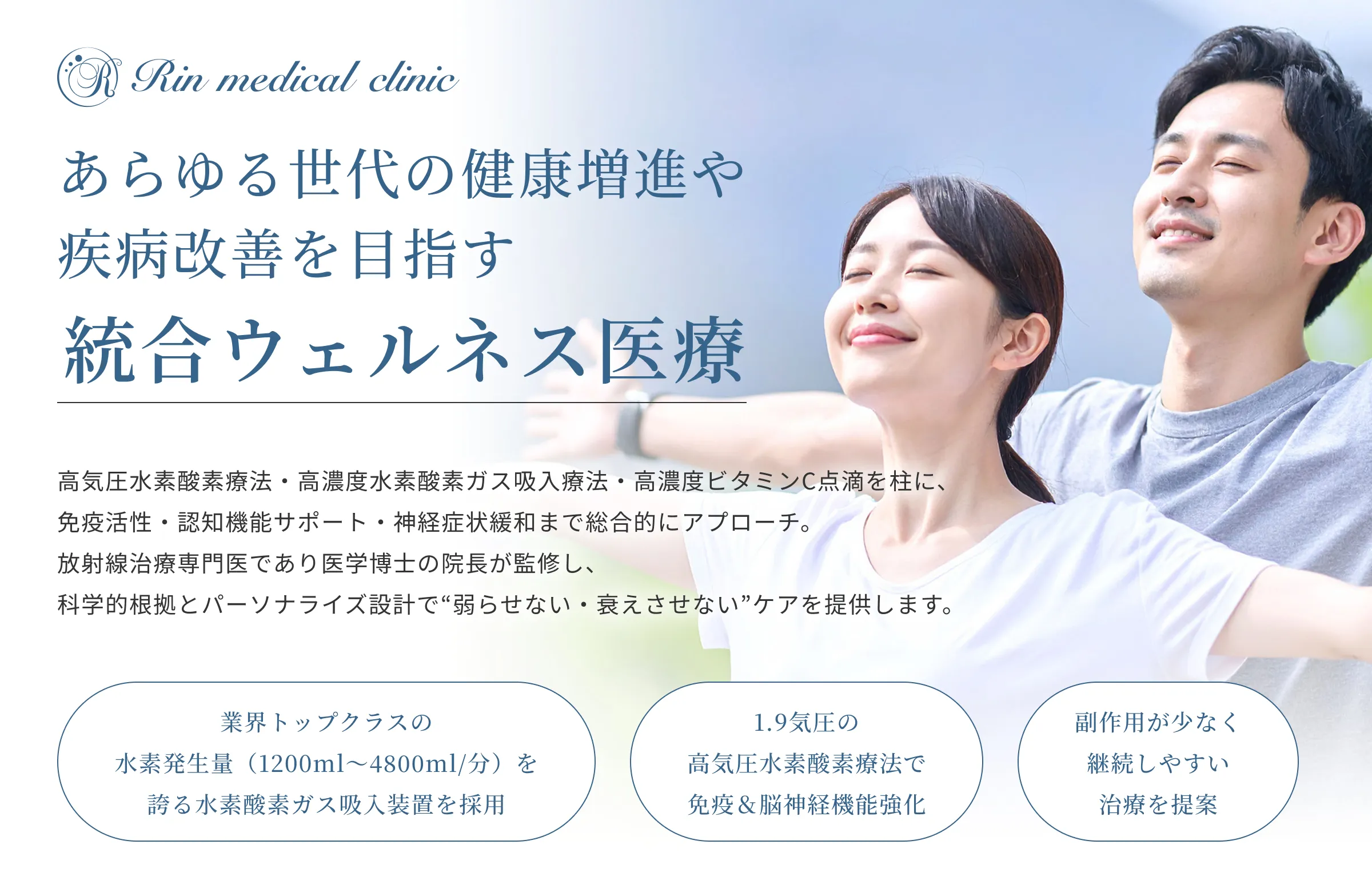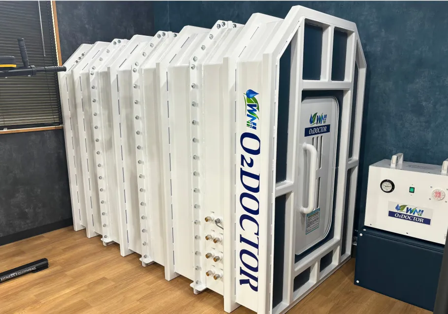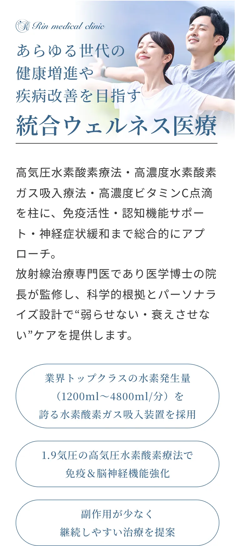1.9気圧のチャンバー内で水素4%+酸素42%を吸入。高気圧により溶存酸素量は通常気圧の約6.5倍となり、同時に水素が全身へ行き渡ります。ヘンリーの法則を利用してミトコンドリアのATP産生効率をアップし、抗炎症・抗酸化作用を発揮します。